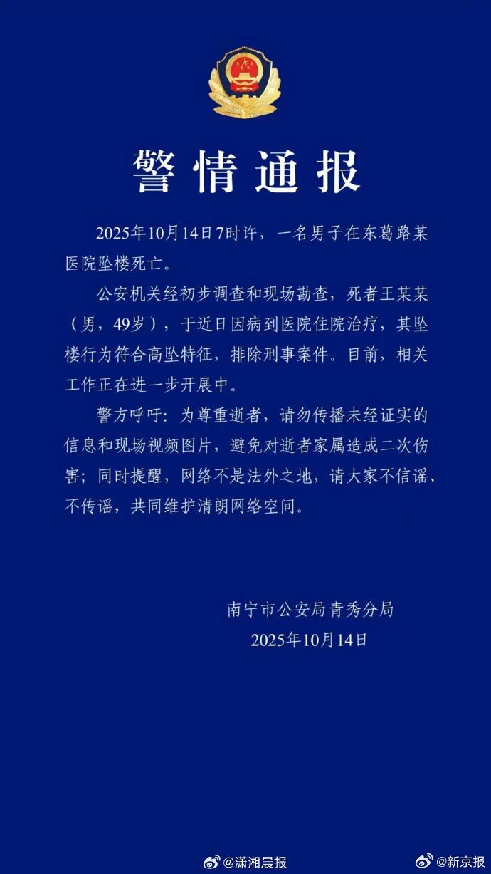 10月14日,广西南宁市公安局青秀分局通报:2025年10月14日7时许,一名男子在东葛路某医院坠楼死亡。公安机关经初步调查和现场勘查,死者王某某(男,49岁),于近日因病到医院住院治疗,其坠楼行为符合高坠特征,排除刑事案件。目前,相关工作正在进一步开展中。警方呼吁:为尊重逝者,请勿传播未经证实的信息和现场视频图片,避免对逝者家属造成二次伤害;同时提醒,网络不是法外之地,请大家不信谣、不传谣,共同维护清朗网络空间。