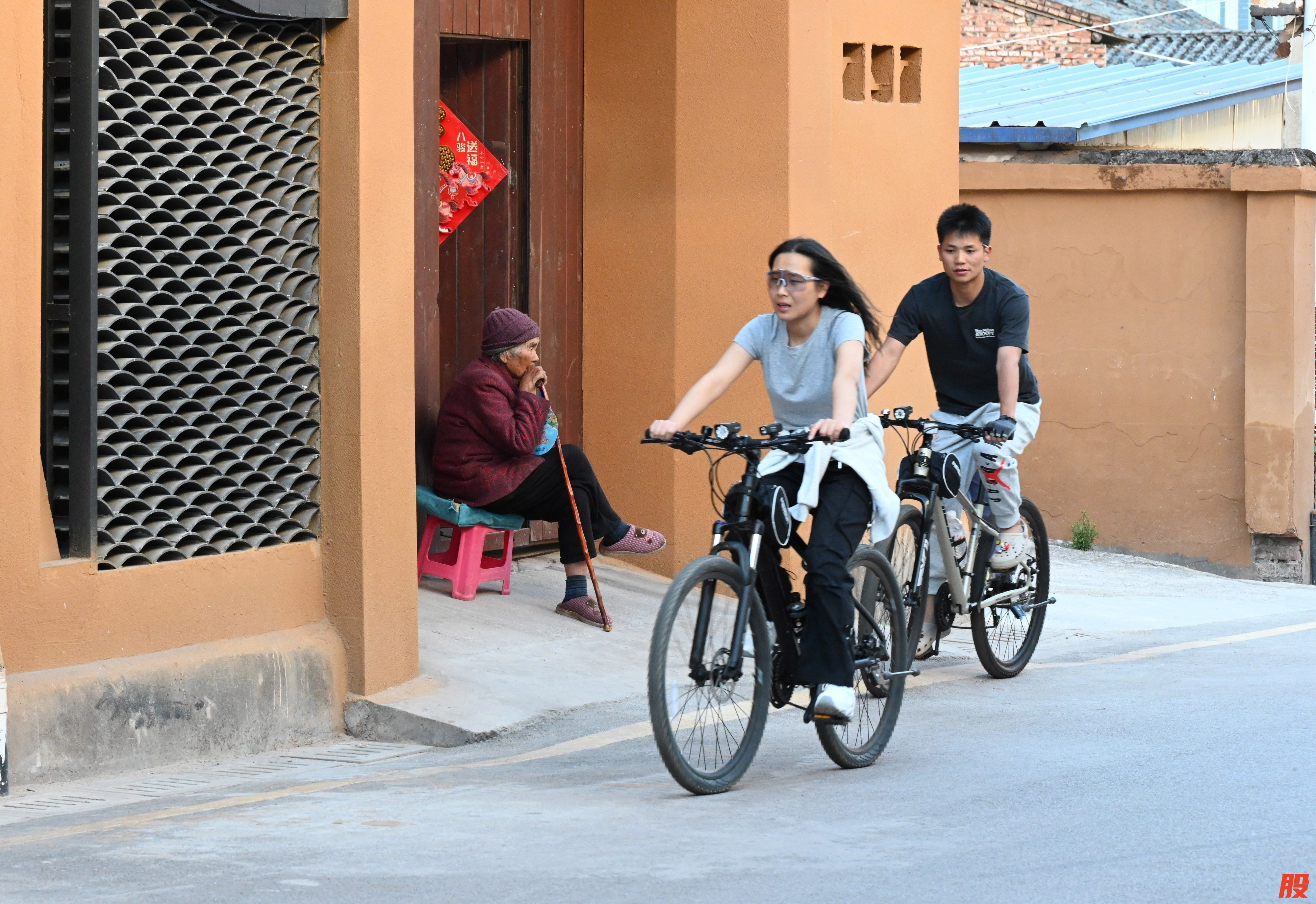 3月26日,东村社区87岁的孙保华老人坐在家门口休息,两名游客骑自行车从她家门口经过。